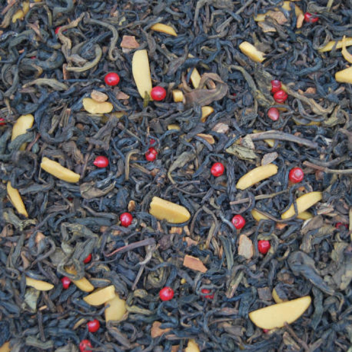 té verde, trozos de canela, trozos de almendra, aromas, clavo, pimienta negra, flor de nuez moscada, aromas naturales
