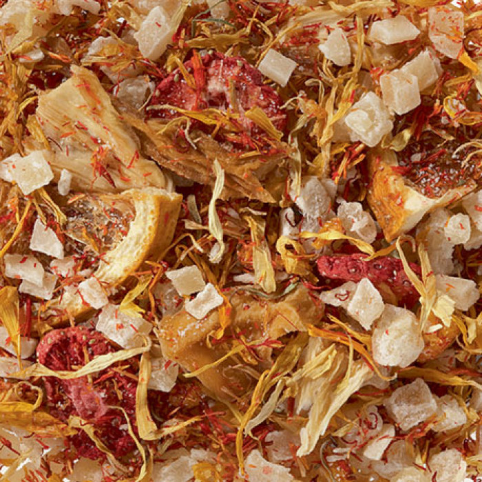 Cubos de piña y mango confitados, copos de piña y mango , rebanadas de naranja y fresa, trozos de mandarina, flores de caléndula y aromas.