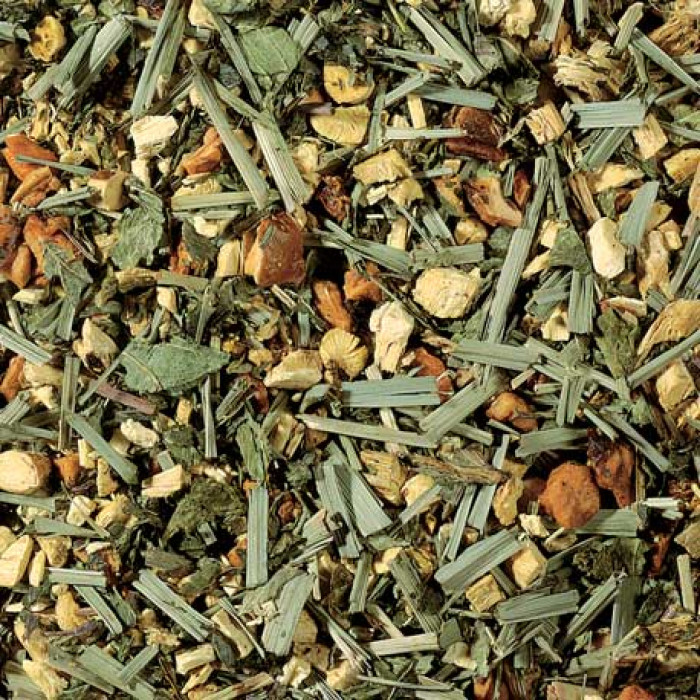 Menta, raíces de regaliz, trozos de manzana, hierba de limón, aromas.